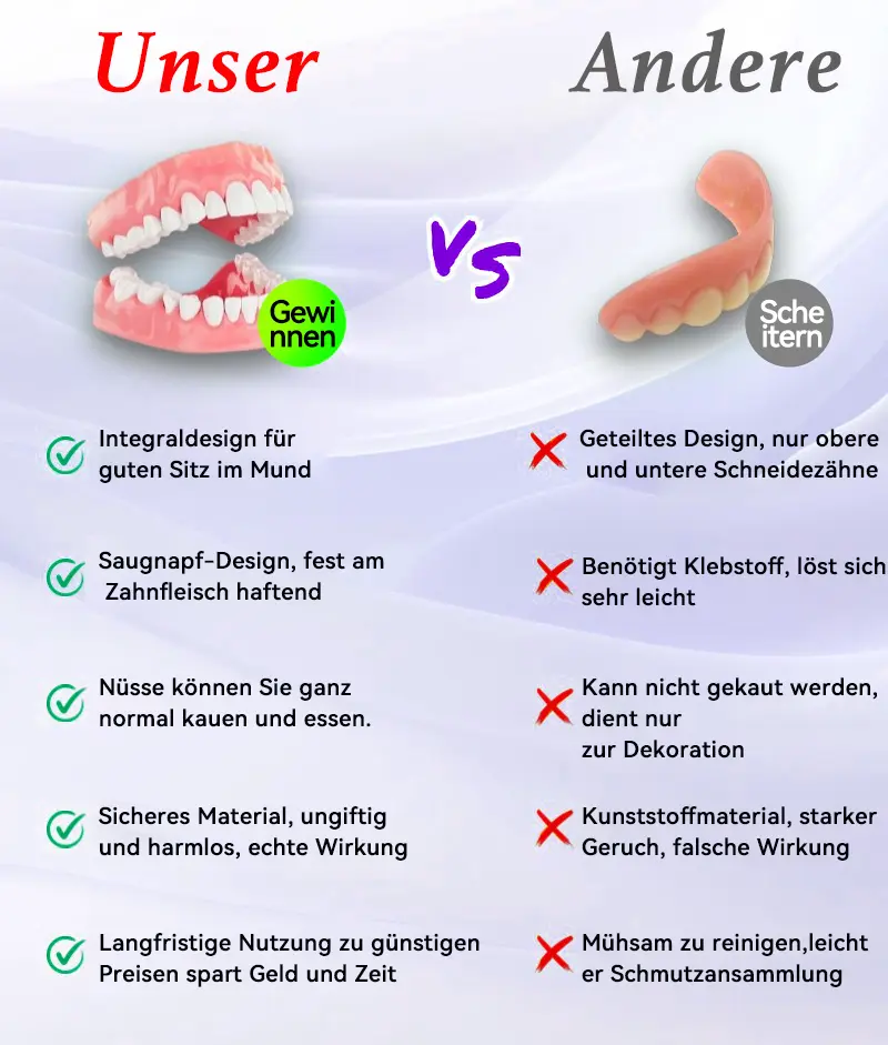 ๐ Vertrauenswรผrdige Qualitรคt und Sicherheit:ย Mit ๐๐ข๐ค๐๐ง๐๐โข kรถnnen Sie auf unser Engagement fรผr Qualitรคt und Sicherheit vertrauen. Das ๐๐ข๐ค๐๐ง๐๐โข-Zahnersatzset besteht aus hochwertigem, ungiftigem Silikon, das sorgfรคltig getestet wird, um sicherzustellen, dass es ebenso sanft zu Ihrem Zahnfleisch wie langlebig ist. Dieses sichere Material bietet eine lang anhaltende, bequeme Passform, sodass Sie die Vorteile Ihres Zahnersatzes ohne Bedenken genieรen kรถnnen. Unser Silikon ist so konzipiert, dass es dem tรคglichen Verschleiร standhรคlt und gleichzeitig seinen Komfort und seine Integritรคt behรคlt, sodass Sie bei jedem Lรคcheln beruhigt sein kรถnnen. Seien Sie versichert, dass Sie mit unserem Set in ein Produkt investieren, bei dem Ihre Gesundheit und Ihr Wohlbefinden im Vordergrund stehen.
