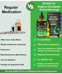 GFOUK®3X Concentrated Mullein Lung Cleanse Drops has been tested by pulmonologists and is completely hypoallergenic, making it suitable for all age groups. Unlike medications, which your body can become dependent on for symptom relief, GFOUK®3X Concentrated Mullein Lung Cleanse Drops is 100% natural and can serve as a replacement for many prescription and over-the-counter respiratory medications and mucus thinners. Over time, it gradually helps improve lung function and strengthen the immune system of the respiratory tract through natural therapy.