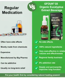 GFOUK®3X Concentrated Mullein Lung Cleanse Spray has been tested by pulmonologists and is completely hypoallergenic, making it suitable for all age groups. Unlike medications, which your body can become dependent on for symptom relief, GFOUK®3X Concentrated Mullein Lung Cleanse Spray is 100% natural and can serve as a replacement for many prescription and over-the-counter respiratory medications and mucus thinners. Over time, it gradually helps improve lung function and strengthen the immune system of the respiratory tract through natural therapy.