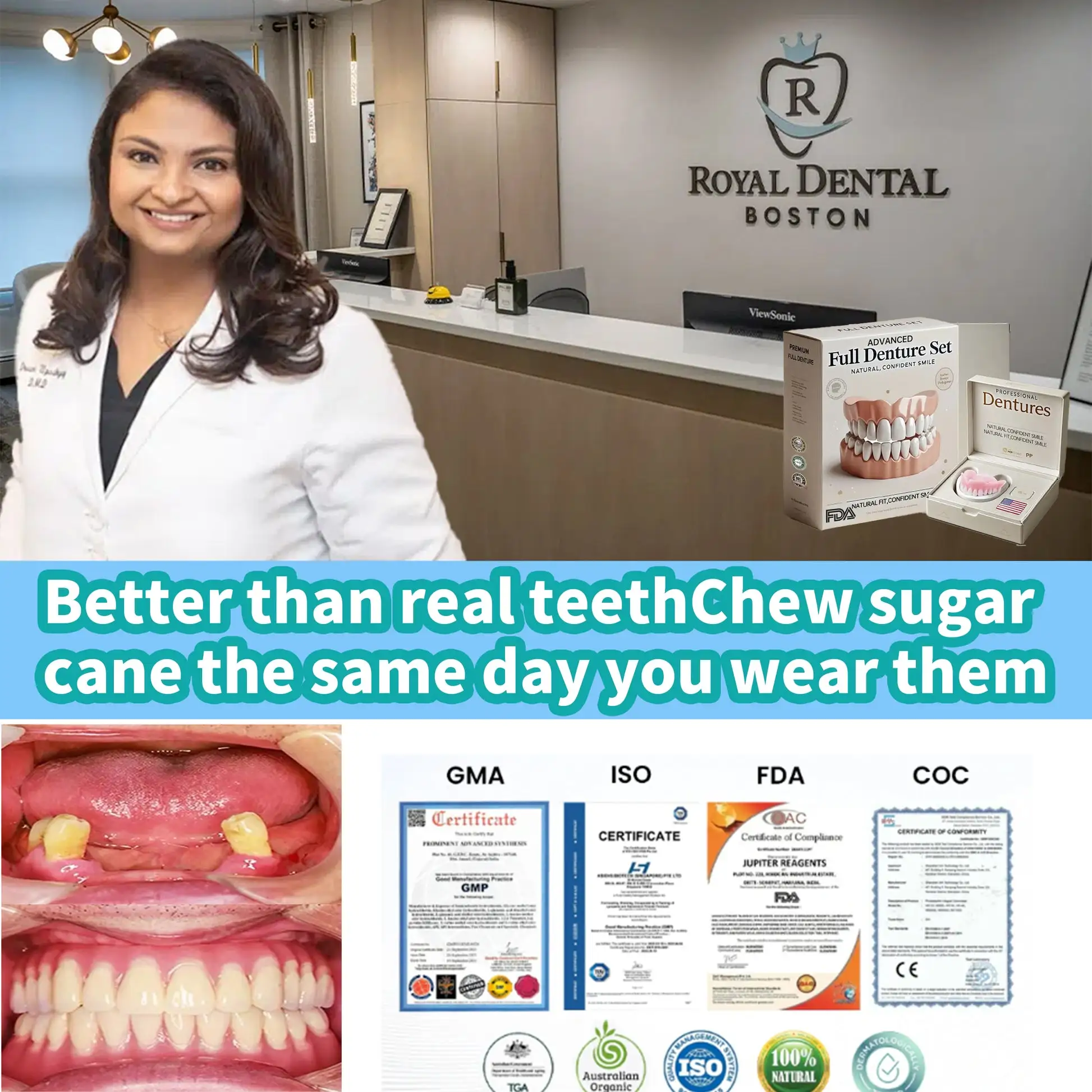 Instant Perfect Smile: Transform your smile instantly with the . Experience the satisfaction of achieving a flawless. customized fit right away. Our innovative denture set eliminates the discomfort of poorly fitting dentures. offering you a snug and natural feel that makes your dentures feel like a true part of your mouth. Say goodbye to sore spots and irritation as Denture Set provides immediate relief. allowing you to enjoy your smile with newfound confidence and comfort. Enjoy a seamless transition to a better-fitting. more comfortable denture experience without delay.