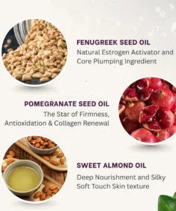 Pomegranate seed oil is packed with ellagic acid and plant-based estrogens that effectively promote skin renewal and elasticity. It helps improve the firmness and radiance of the breast and hip skin, activates collagen synthesis, and reduces sagging — leaving contours fuller and smoother. Its antioxidant power delays aging and maintains youthful, lifted curves for longer.