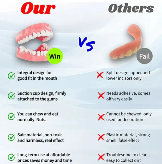 Instant Perfect Smile: Transform your smile instantly with the . Experience the satisfaction of achieving a flawless. customized fit right away. Our innovative denture set eliminates the discomfort of poorly fitting dentures. offering you a snug and natural feel that makes your dentures feel like a true part of your mouth. Say goodbye to sore spots and irritation as Denture Set provides immediate relief. allowing you to enjoy your smile with newfound confidence and comfort. Enjoy a seamless transition to a better-fitting. more comfortable denture experience without delay.