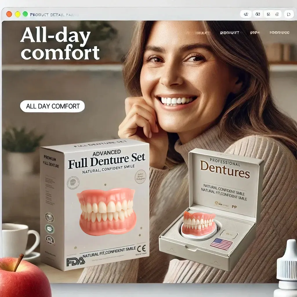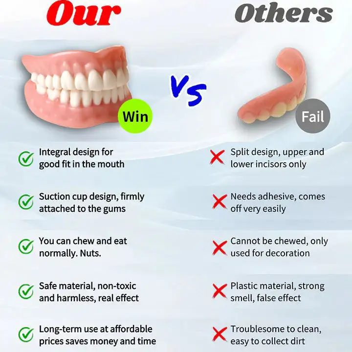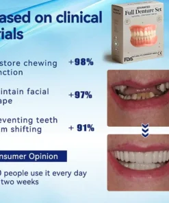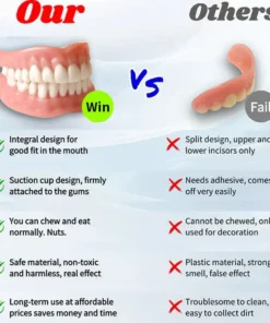 Instant Perfect Smile: Transform your smile instantly with the . Experience the satisfaction of achieving a flawless. customized fit right away. Our innovative denture set eliminates the discomfort of poorly fitting dentures. offering you a snug and natural feel that makes your dentures feel like a true part of your mouth. Say goodbye to sore spots and irritation as Denture Set provides immediate relief. allowing you to enjoy your smile with newfound confidence and comfort. Enjoy a seamless transition to a better-fitting. more comfortable denture experience without delay.