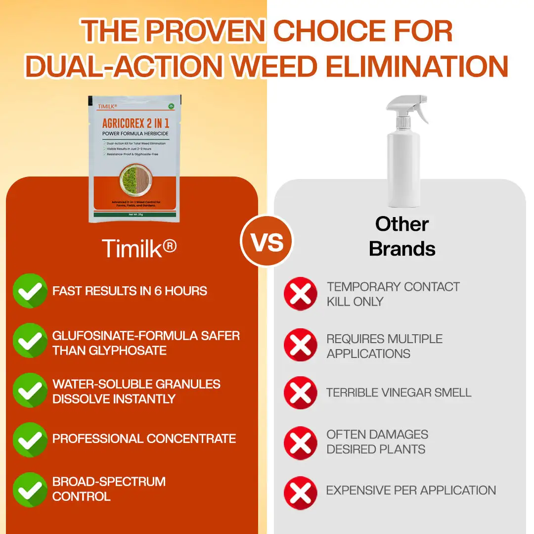 With over 9 million applications worldwide and trusted by farmers, gardeners, and agricultural professionals, Timilk® AgriCoreX 2-in-1 Power Formula Herbicide is fast becoming the #1 choice for advanced weed control. Field-tested and proven effective against resistant species, it delivers visible results within hours and long-lasting protection. We’re so confident in its performance that we offer a 90-day, 100% money-back guarantee — see results, or get your money back, no questions asked.
