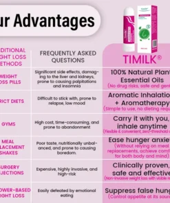 Timilk® AromaSatiety Essential Stick for Appetite Control is built on the science of aromatic satiety, using a unique blend of natural essential oils to influence the brain through olfactory signals. By gently stimulating the appetite control center, it helps suppress unnecessary cravings, enhance natural feelings of fullness, and calm emotional hunger. Unlike traditional methods that force the body through harsh diets or drugs, this innovative approach works in harmony with your brain and senses, making it easier to eat less naturally and achieve effortless, sustainable weight loss.