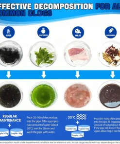 - Chlorine-Based Cleaning Agent — provides strong cleaning power that helps attack stubborn residue and odor-causing gunk inside the drain.
