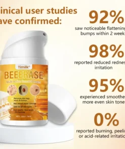 Raised skin formations such as skin tags, small warts, keratin bumps, friction-thickened patches, and dark rough spots all stem from the same root causes: an excessive buildup of keratin, where dead skin cells compact into hardened plugs, combined with chronic micro-inflammation triggered by friction, aging, hormonal changes, or repeated irritation. By targeting both the overproduction of keratin and the inflammation that drives abnormal skin growth, Timilk® BeeErase delivers a deeper, more effective correction than acid peels or freezing treatments, restoring the skin’s natural smoothness without pain or damage.