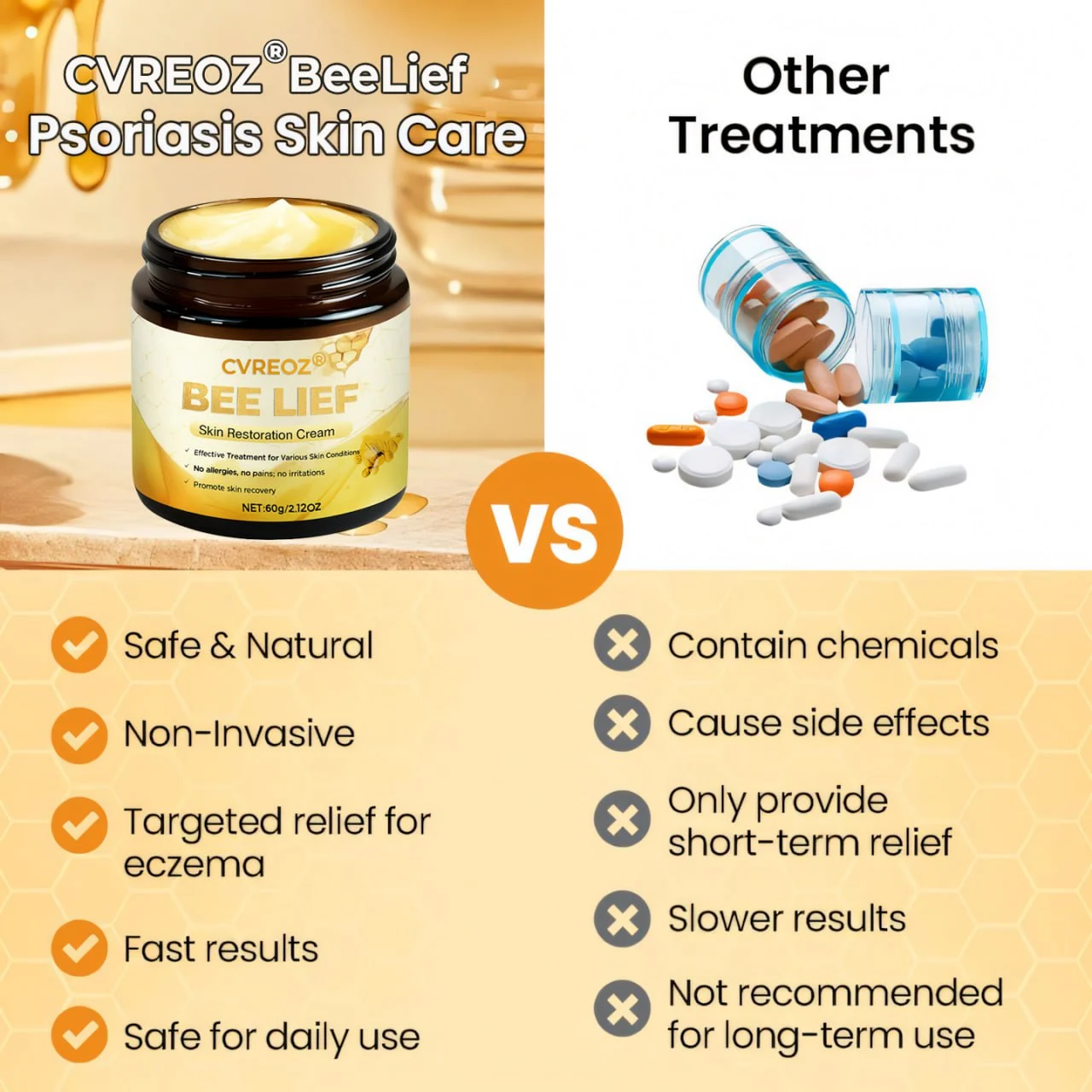 Cvreoz® BeeLief Psoriasis Skin Care Cream is a dermatologist-formulated solution designed to soothe redness, itching, and scaling without steroids or harsh chemicals.