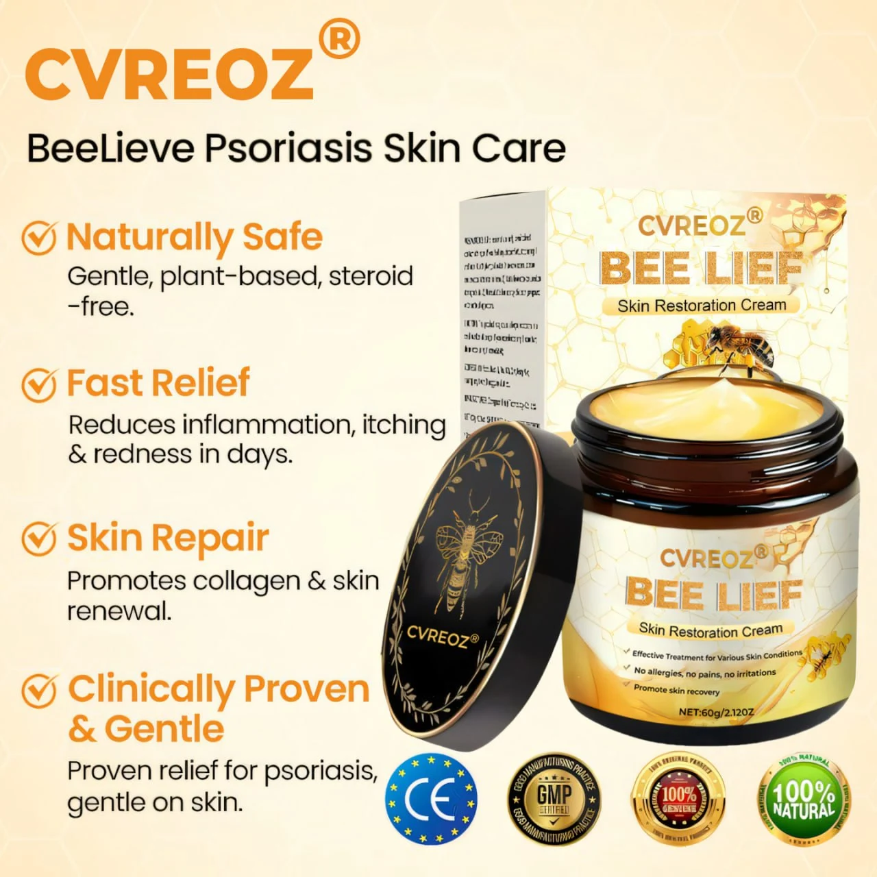 Cvreoz® BeeLief Psoriasis Skin Care Cream offers a natural, steroid-free alternative. Its key ingredient, bee venom peptides, helps block inflammation triggers while stimulating collagen production to repair and strengthen the skin. Combined with tea tree oil, licorice root extract, shea butter, and allantoin, it soothes irritation, prevents infections, deeply moisturizes, and restores the skin barrier—delivering lasting relief and promoting healthier, more resilient skin with continued use.