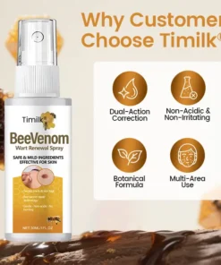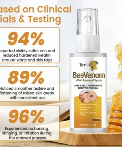Timilk® BeeVenom Wart Renewal Spray supports the skin’s natural renewal process. Its bee venom–powered formula helps gradually soften hardened keratin buildup that forms warts and skin tags, while calming the surrounding skin and allowing raised areas to smooth and flatten over time—without burning or damaging healthy skin.