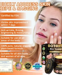 Endorsed by Dr. Sophia L Williams, a board-certified dermatologist with over 10 years of expertise in skincare, Allybee™ BOTOX Bee Venom All-in-one Treatment Cream comes highly recommended. This exceptional product provides an ideal remedy for an array of skin issues, including neck lines, sagging arms, drooping breasts, chest discomfort, stretch marks, cellulite on the abdomen, thighs, and buttocks, as well as sagging buttocks, among others. Importantly, it achieves these results without any adverse side effects. Crafted entirely from 100% natural plant extracts, this cream is suitable for all skin types, including sensitive skin.