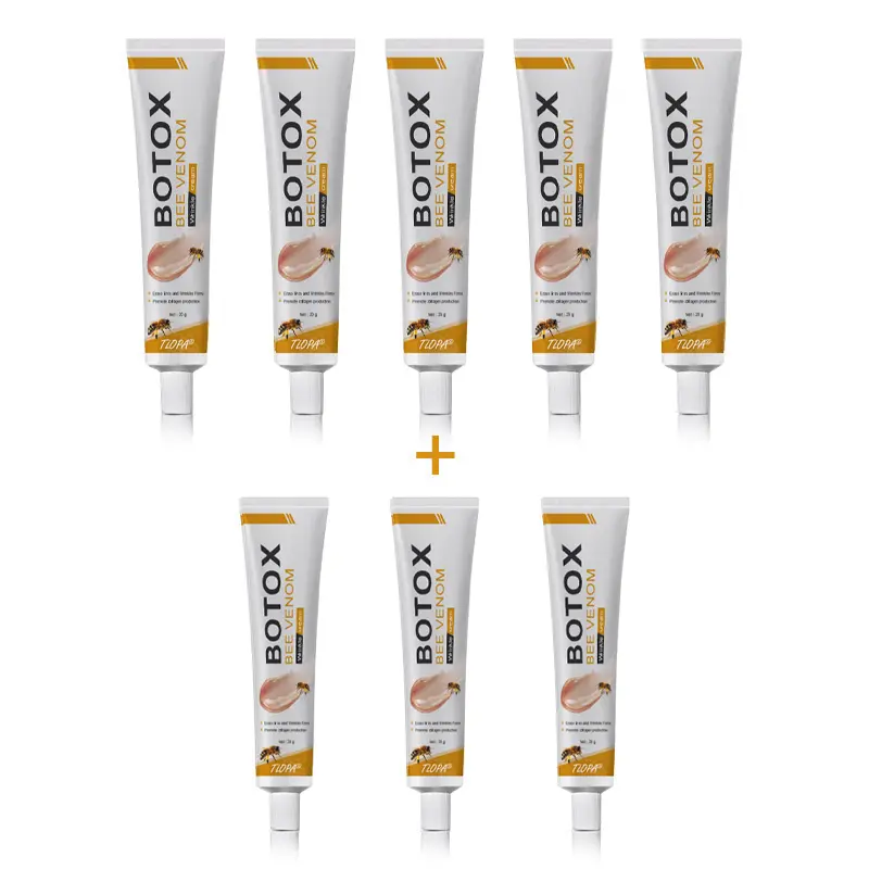 TLOPA® Botox Bee Venom Wrinkle Removal Cream stimulates collagen production, deeply firms the skin, and helps restore facial elasticity and contours. Bee venom peptides mimic the effects of Botox, relaxing facial muscles and lifting sagging areas to reshape well-defined, youthful facial lines. Powerful hydrating ingredients lock in moisture, keeping the skin plump and full, making your facial contours appear tighter and more youthful, with a natural glow.