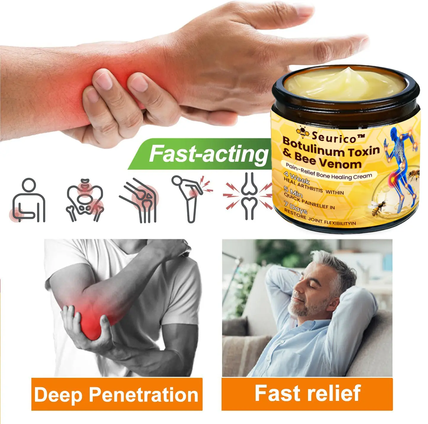 The Seurico™ Botulinum Toxin & Bee Venom Pain-Relief Bone Healing Cream is known for its effectiveness in treating a variety of orthopedic issues.