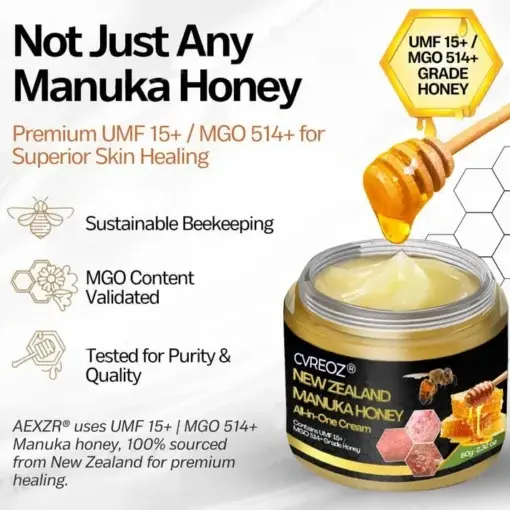 Cvreoz® New Zealand Manuka Honey All-in-One Cream is a targeted treatment for chronic skin issues like eczema, psoriasis, and butt acne. Powered by high-grade UMF 15+ / MGO 573+ Manuka honey, it penetrates deeply to calm inflammation, eliminate harmful bacteria, and repair the skin barrier, delivering visible results in weeks. Fast-absorbing and non-irritating, the cream begins working within 3 minutes, promoting cell regeneration and providing long-lasting relief.