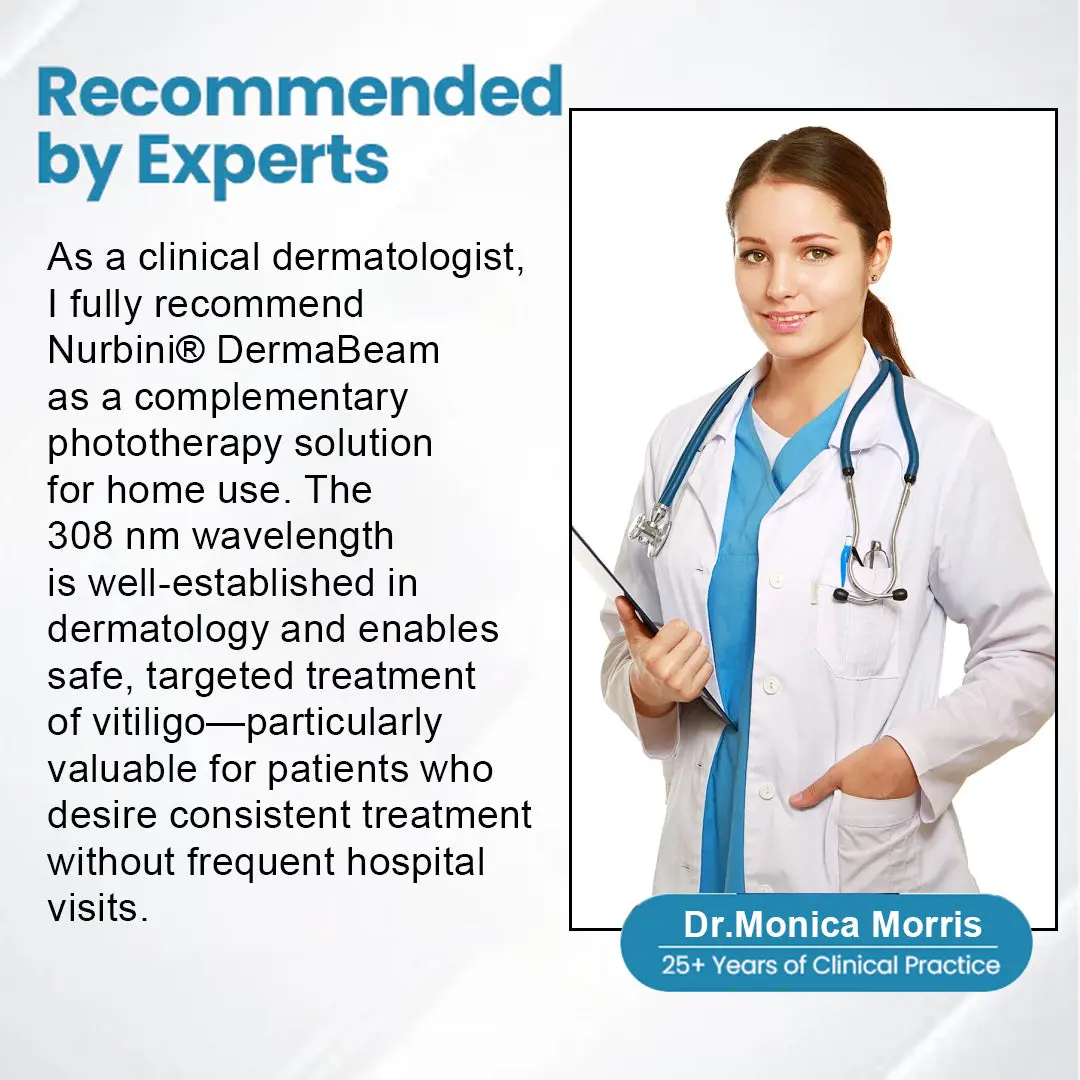 - 👩Yes. Nurbini® DermaBeam uses clinically proven 308nm narrowband UVB light therapy, which is widely used by dermatologists to stimulate melanin production and restore pigmentation in vitiligo patients.
