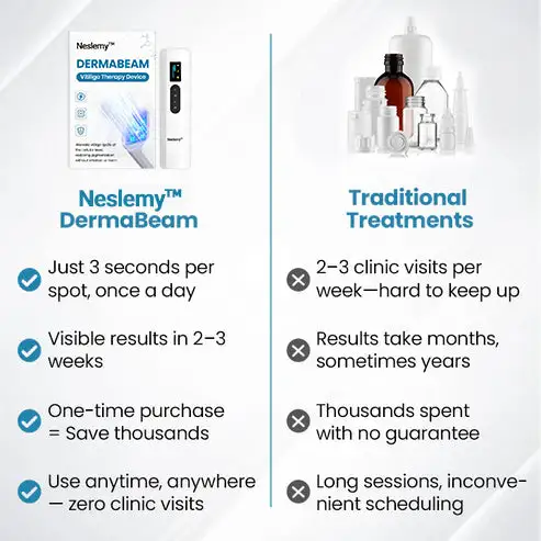 Unlike traditional treatments that require frequent clinic visits and long recovery times, Neslemy™ DermaBeam requires only a few minutes daily — with visible improvements in just weeks. Whether you’re looking to restore skin tone or manage recurring vitiligo symptoms, it offers a simple, effective, and affordable clinical solution at home.