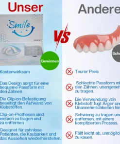 Verabschieden Sie sich von fehlenden, beschädigten oder unvollkommenen Zähnen mit den formbaren GDOUK™-Prothesen. Im Gegensatz zu billigen Alternativen bietet unser hochwertiges Produkt professionelle Prothesen, die genauso aussehen und sich anfühlen wie echte Zähne – und das zu einem erschwinglichen Preis. Wir haben Prothesen entwickelt, die auf verschiedene Altersgruppen und Geschlechter abgestimmt sind, um für jeden eine perfekte und komfortable Passform zu gewährleisten.