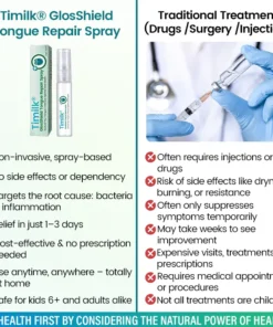 “Timilk® GlosShield Tongue Repair Spray has been widely recognized by dental researchers and ENT specialists as a breakthrough in mucosal healing and tongue care. Its advanced botanical micro-spray technology is designed to penetrate deeply into inflamed and irritated tongue tissue, promoting rapid, root-level healing. Clinical studies have consistently shown that GlosShield’s triple-action formula significantly improves symptoms such as tongue swelling, white coating, dryness, pain, and bacterial buildup within just days of use. Unlike conventional mouthwashes or topical gels that offer only surface-level relief, GlosShield works at a deeper level—without causing irritation, stinging, or relying on synthetic chemicals. This innovation represents a new standard in at-home tongue and oral care, delivering professional-grade results in a gentle, convenient spray.”