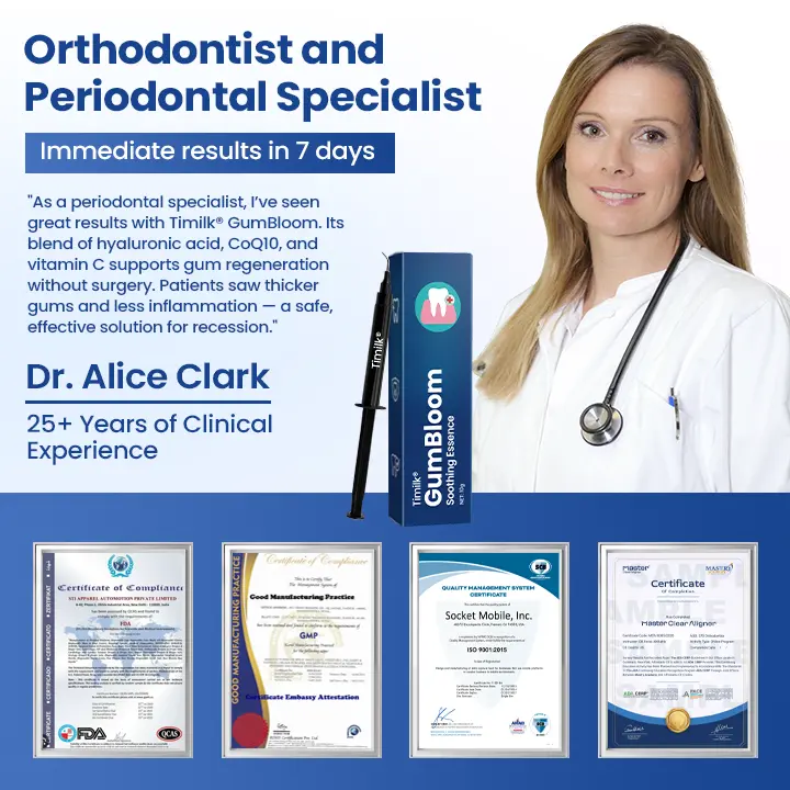 “As a practicing orthodontist and periodontal specialist, I’m genuinely impressed by the regenerative potential of Timilk® GumBloom. The combination of hyaluronic acid, coenzyme Q10, and vitamin C, along with its advanced transdermal delivery system, represents a true innovation in non-invasive gum care.