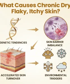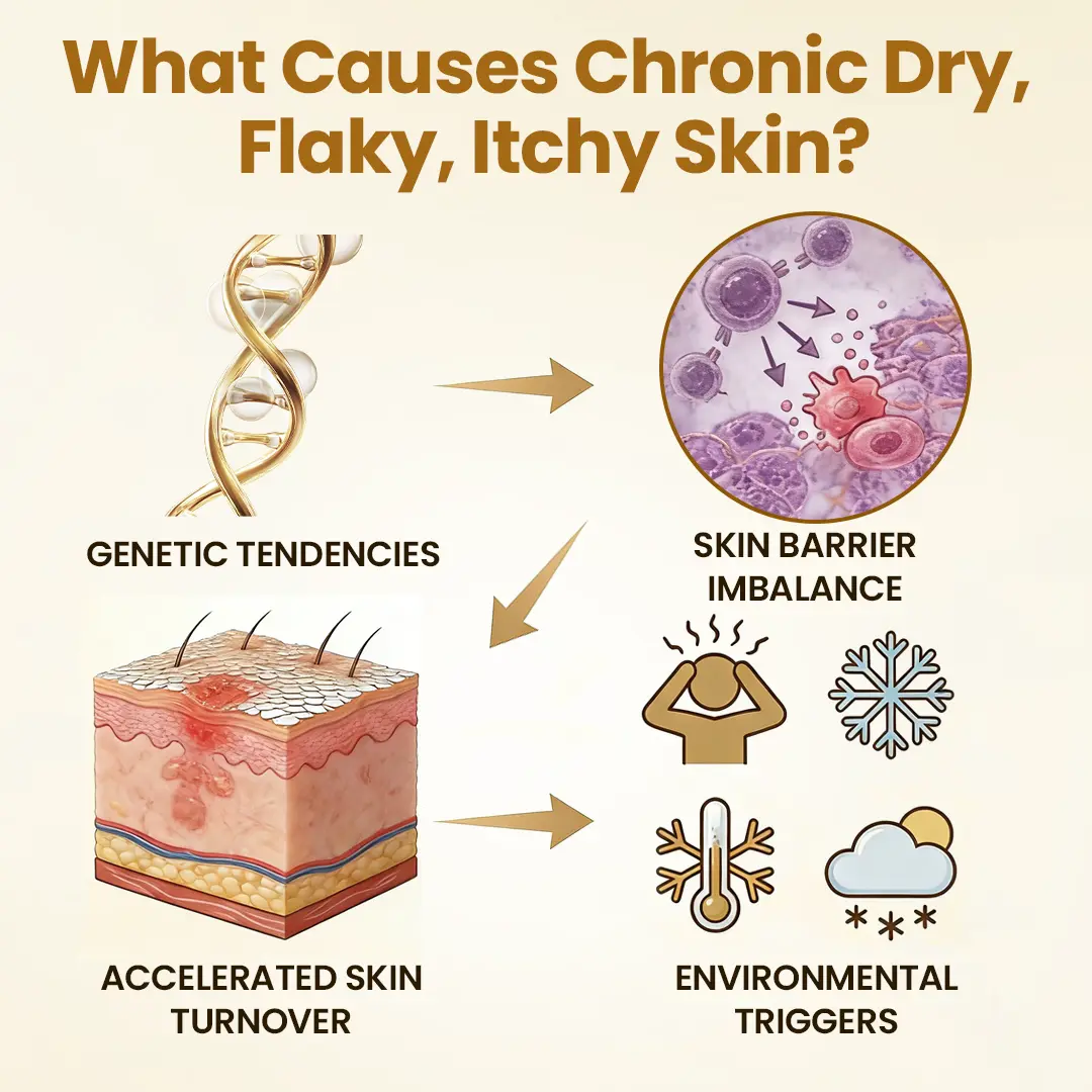 These symptoms are often linked to a combination of genetic tendencies, skin barrier imbalance, and environmental triggers — causing skin to renew too quickly and appear red, rough, and irritated.