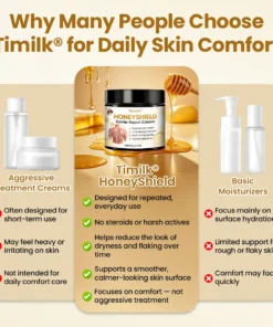 Timilk® HoneyShield focuses on comfort support + barrier care, helping skin feel calmer, look smoother, and stay comfortable longer — not just temporarily moisturized.