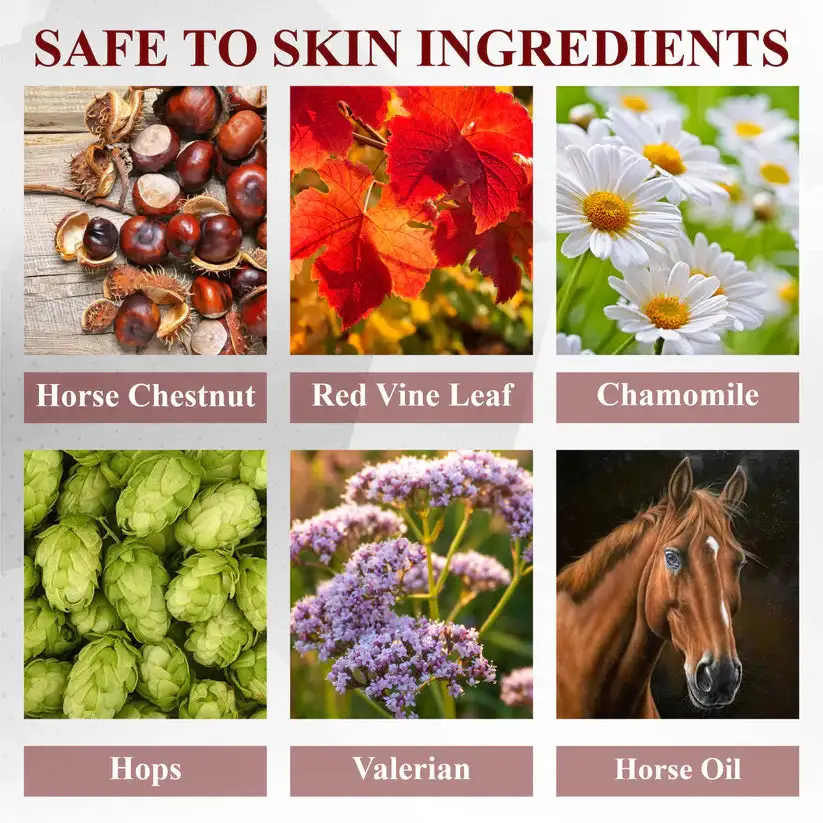NESLEMY™ Horse Chestnut Arthritis Massage Cream combines powerful ingredients to provide effective relief. Red vine leaf enhances circulation and reduces inflammation, while horse chestnut strengthens blood vessels and alleviates joint pain. Chamomile and hops have calming properties that help reduce swelling and ease discomfort, and valerian supports muscle relaxation. Horse oil deeply moisturizes, promoting skin regeneration and soothing irritated areas.