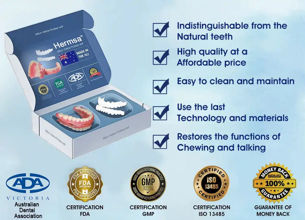 HERMSA™ is committed to transforming lives with innovative dental solutions that improve both your physical comfort and emotional well-being. Experience the freedom and confidence that countless others have already embraced with the HERMSA™ Premium Custom Silicone Denture Set. Join our growing community and discover how easy it can be to enjoy a radiant, confident smile every day!