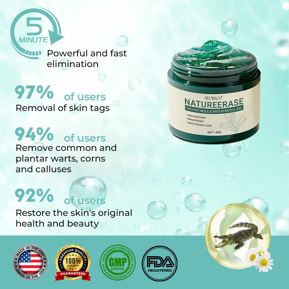 The Seurico™ Instant Blemish & Mole Eraser Gel is crafted to swiftly and efficiently eliminate skin imperfections such as moles, skin tags, dark spots, and blemishes. It harnesses the potency of three crucial natural components—Alligator Oil, Chamomile Extract, and Seaweed Extract—to painlessly target and remove these flaws, leaving your skin smooth, radiant, and flawless.