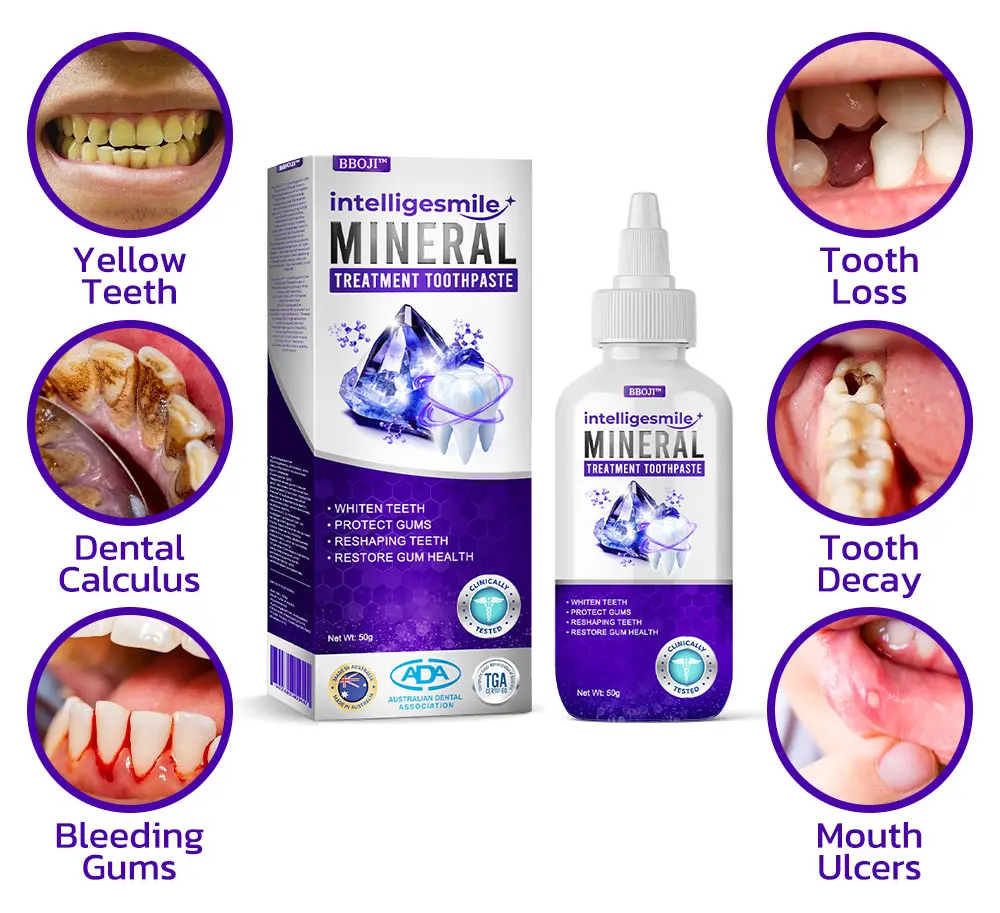 BBOJI™ IntelligeSmile Mineral Treatment Toothpaste eliminates 99.99% of bacteria, resolves bad breath, removes plaque and tartar, treats gingivitis and periodontitis, relieves toothache, prevents and treats cavities, restores tooth enamel, stimulates reparative dentin formation, and supports the regeneration of lost teeth.