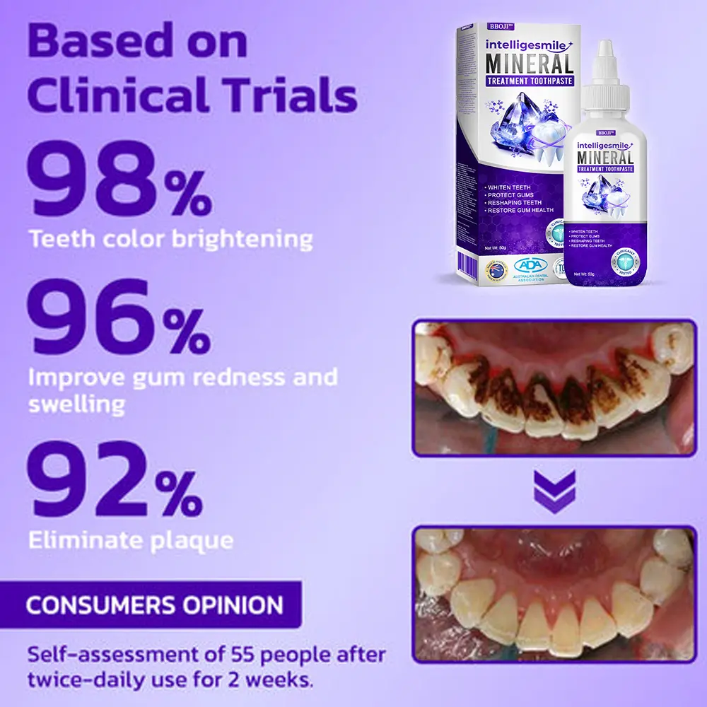 Mineral elements help kill bacteria and eliminate harmful bacteria within the gums, helping to repair cavities and promote long-term oral health. BBOJI™ IntelligeSmile Mineral Treatment Toothpaste delivers essential nutrients directly to the teeth and gums for rapid absorption, promoting fast cavity recovery, cavity repair and improved overall gum health.