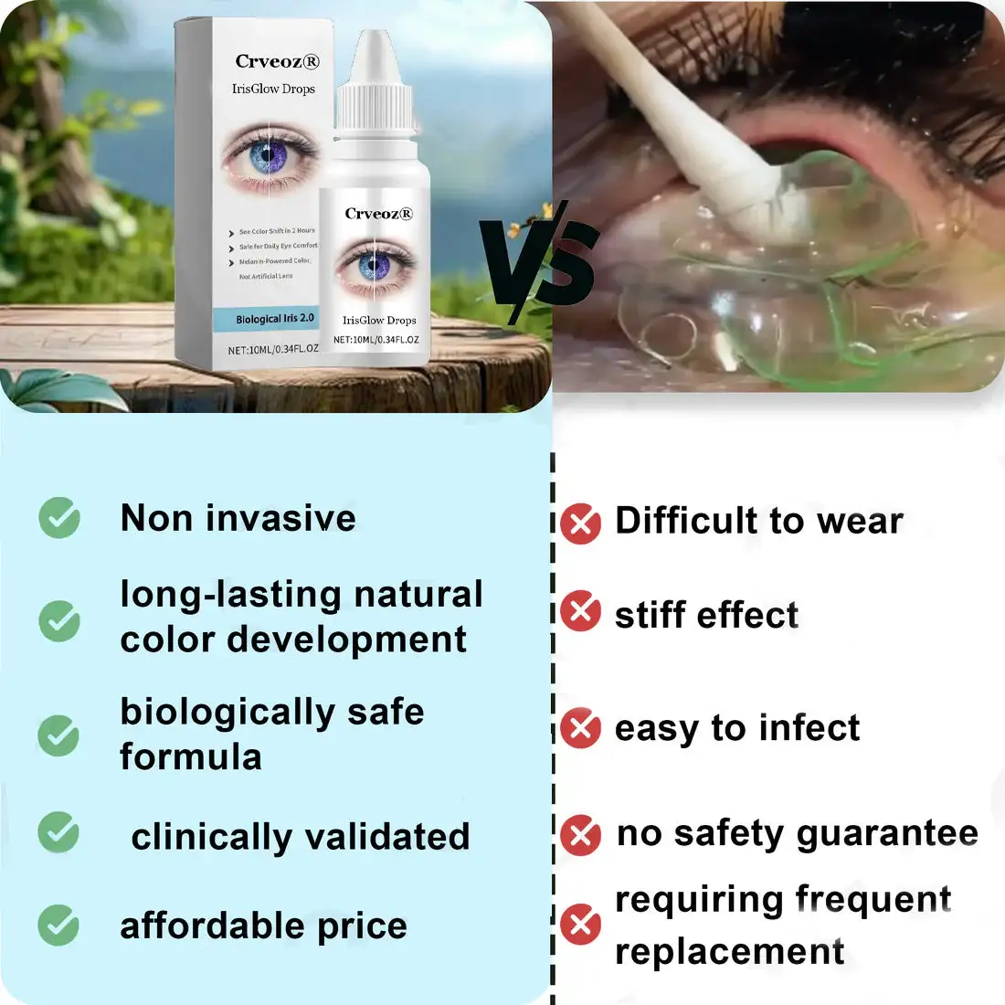 I used Cvreoz® EyeCandy Drops Changing Drops for a special event, and my eyes looked absolutely stunning. The color change was vibrant but still natural, and I received so many compliments throughout the night. It felt amazing to have such bright, captivating eyes without any discomfort. I’m hooked – this is my new beauty secret! – Ellen V.