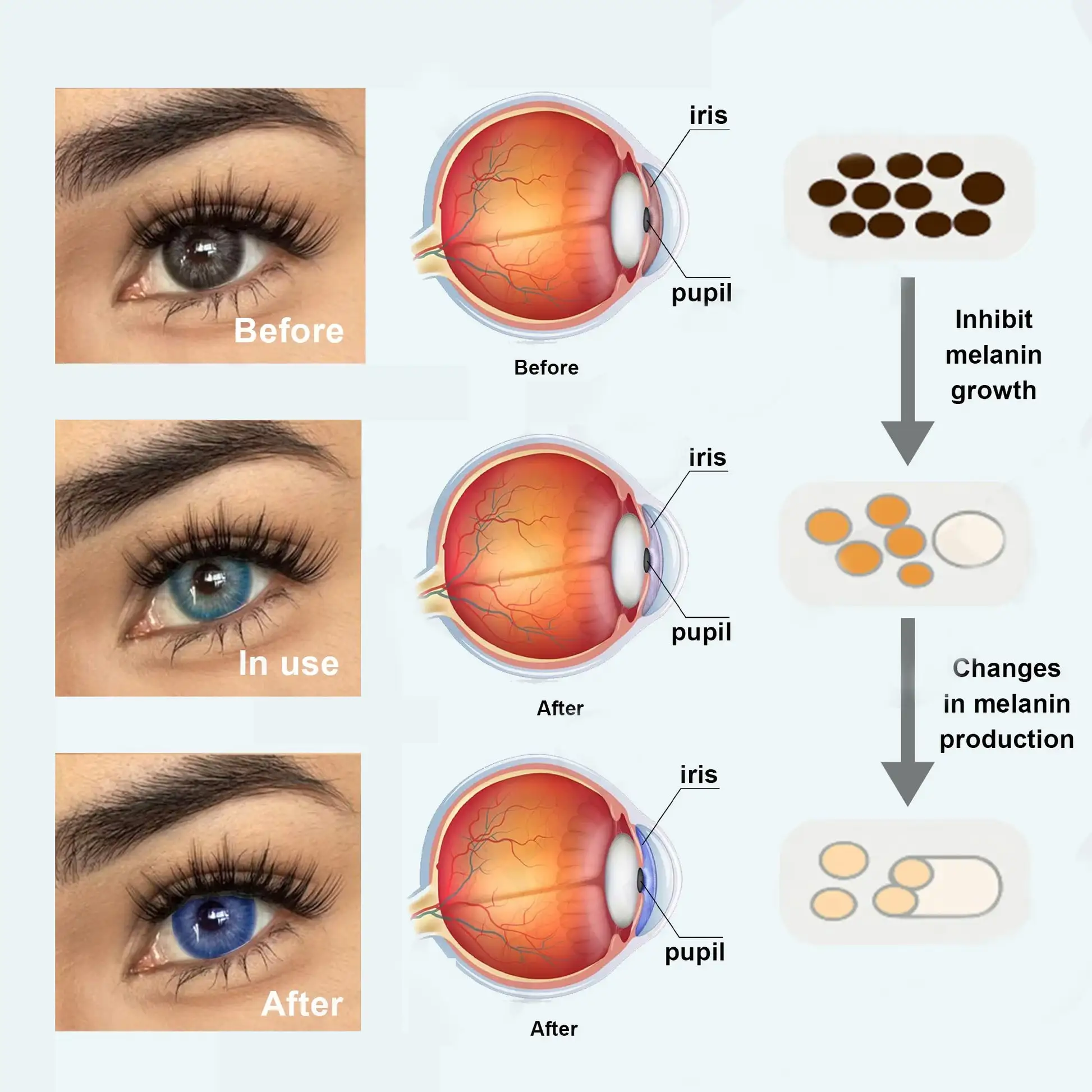 Clinical trials have shown that the product shows good eye color change effect in 94% of volunteers and is safe to use with no allergic reaction or irritation, complying with U.S. and European cosmetic safety standards. The mechanism of eye color change is mainly achieved by affecting the distribution of melanin in the iris.