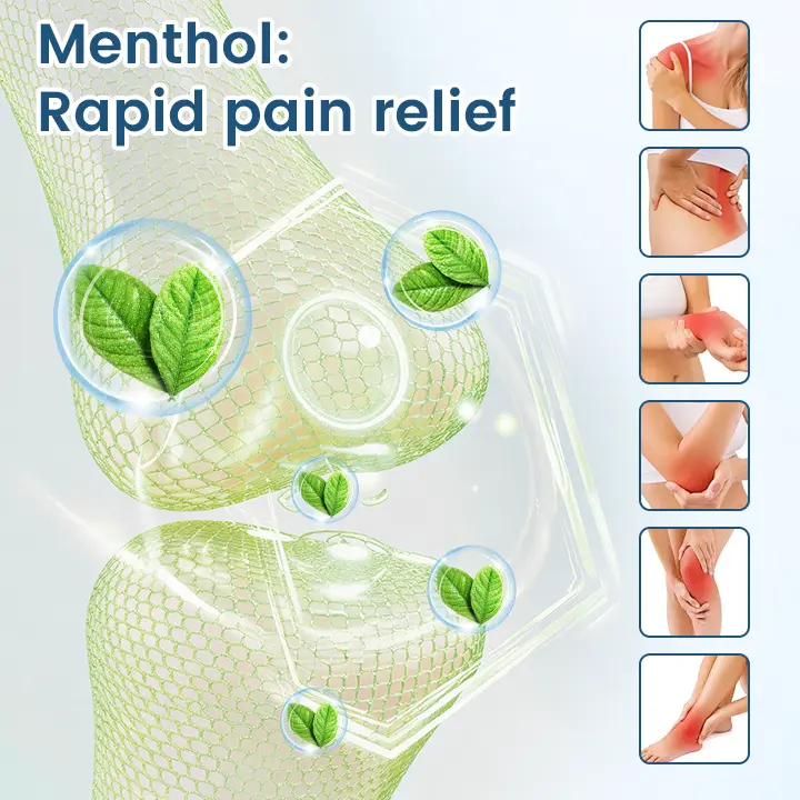 Menthol:Menthol activates TRPM8 cold receptors in the skin, creating a refreshing cooling sensation that immediately calms pain and inflammation.It blocks chronic pain signals and provides rapid comfort within minutes of application.