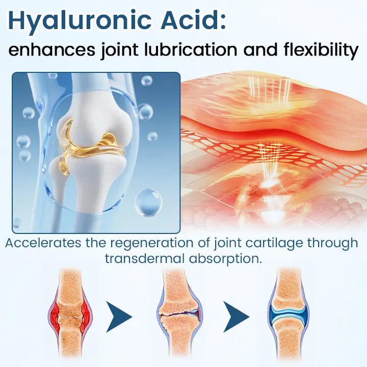 Hyaluronic Acid:A key joint lubricant that restores natural moisture balance, reduces friction between bones, and relieves dryness and stiffness.It helps maintain smooth, flexible movement and long-term comfort.