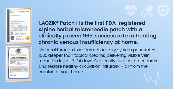 LAOZIK® Vein Ease is the first FDA-registered Alpine herbal microneedle patch with a clinically proven 96% success rate in treating chronic venous insufficiency at home. Its breakthrough transdermal delivery system penetrates 100x deeper than topical creams, delivering visible vein reduction in just 7–14 days. Skip costly surgical procedures and restore healthy circulation naturally – all from the comfort of your home.