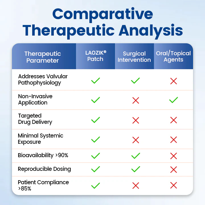 LAOZIK® Vein Ease represents the first commercially available transdermal phytotherapy system specifically designed to address venous valvular insufficiency through localized botanical intervention. Unlike systemic treatments that dilute active compounds throughout the circulatory system or topical applications that cannot penetrate the dermal barrier, our microneedle delivery system ensures concentrated therapeutic compounds reach the target tissue with minimal systemic exposure.