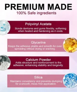 Polyvinyl Acetate (PVA): A key binding agent known for its excellent adhesion properties, Polyvinyl Acetate helps form a durable, flexible bond between the denture and the gum surface. Its thermoplastic nature allows it to soften when heated, then firm up as it cools—creating a custom-fit seal that stays in place for days.