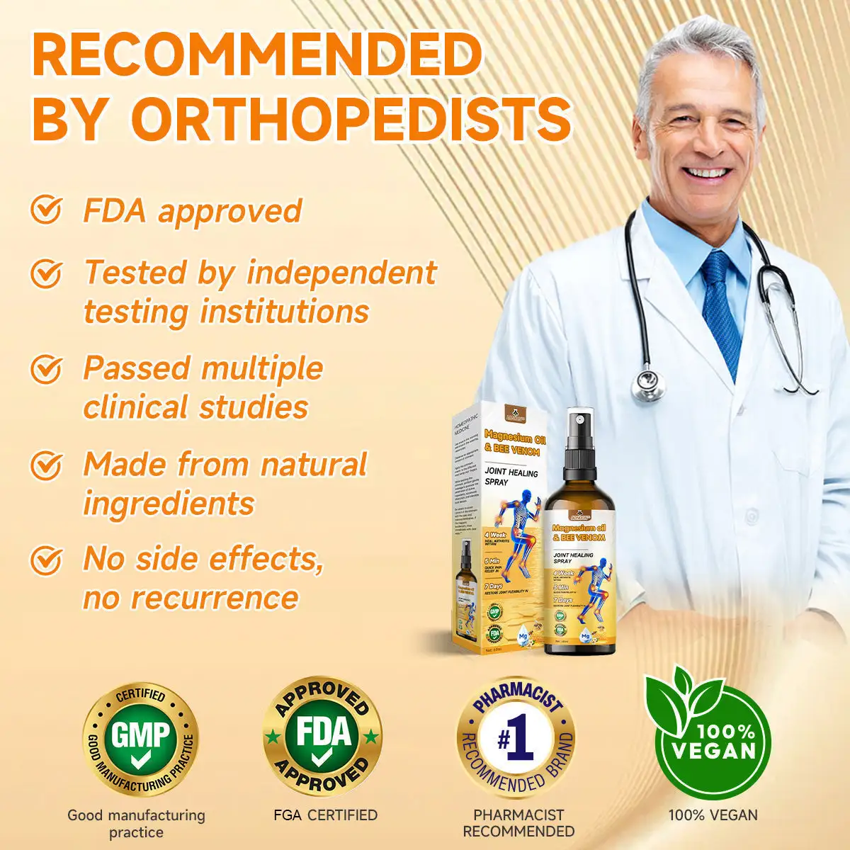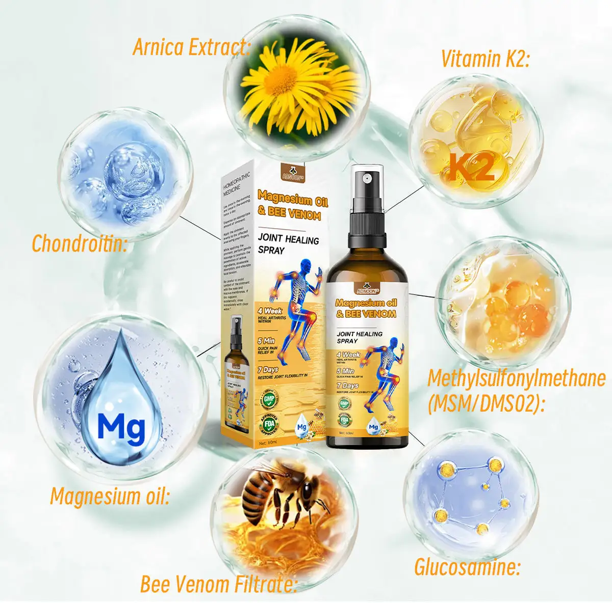 “As an orthopedic surgeon, I endorse ADNOON™ Magnesium Oil & Bee Venom Joint Healing Spray for individuals suffering from joint and bone conditions such as osteoarthritis, rheumatoid arthritis, and other inflammatory disorders. This spary contains active ingredients like bee venom filtrate, glucosamine, and chondroitin, which work to alleviate inflammation, nourish joints, and enhance mobility. It also aids in rebuilding and restoring cartilage and bone tissue, alleviating pain and stiffness while eliminating harmful crystals that can accumulate in joints, thereby improving overall joint function.”