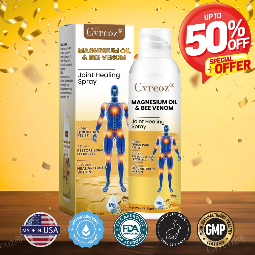 Experience fast relief in just minutes with Cvreoz® Magnesium Oil & Bee Venom Joint Healing Spray. Designed for quick, even application, this powerful spray absorbs rapidly into the skin, delivering magnesium oil deep into the muscles and joints. Magnesium works to relax tense areas, ease pain from arthritis, cramps, and injuries, and significantly reduce inflammation at the root. Many users report noticeable pain relief within just five minutes of use, making Cvreoz® a fast-acting solution for both chronic and occasional joint discomfort.