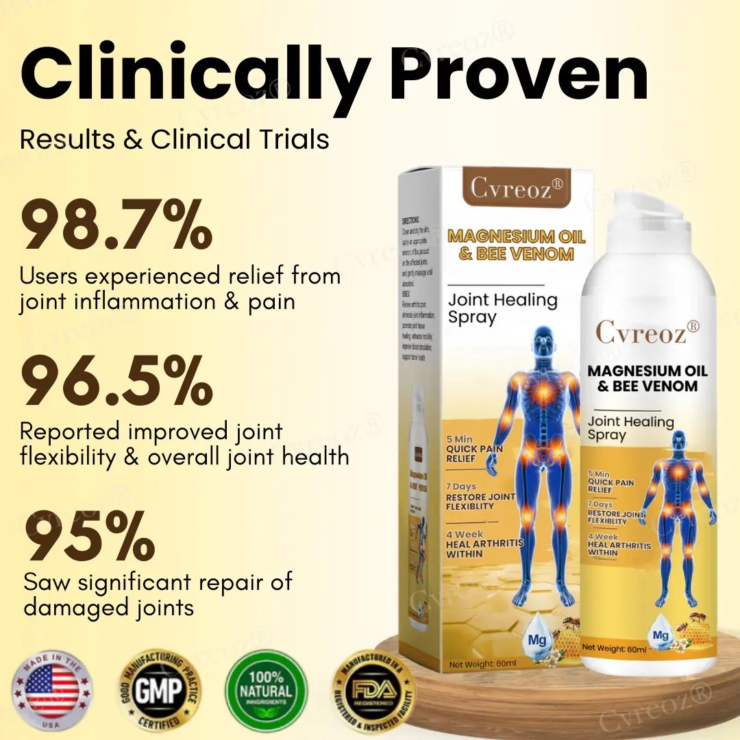 Cvreoz® Magnesium Oil & Bee Venom Joint Healing Spray is clinically trusted and recommended by healthcare professionals for its powerful, natural approach to relieving joint pain, stiffness, and inflammation. Infused with high-grade magnesium oil and anti-inflammatory bee venom, this advanced formula targets the root causes of joint discomfort—reducing swelling, enhancing mobility, and improving joint lubrication with every use.
