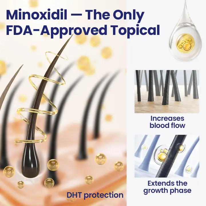 Minoxidil is the ONLY -approved topical ingredient clinically proven to regrow hair. Our maximum strength 5% formula delivers: