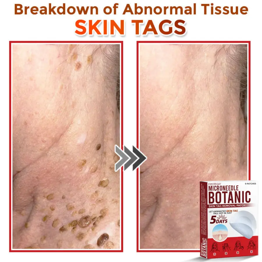 The Fivfivgo® MicroNeedle Botanic Skin Tag Removal Patch is a painless, at-home treatment using microneedles to deliver botanical ingredients for safe, scar-free removal of skin blemishes. It promotes natural tissue regeneration with proven ingredients like Tea Tree Oil, Garlic, and Calendula, offering clear skin without repeated treatments or scarring.