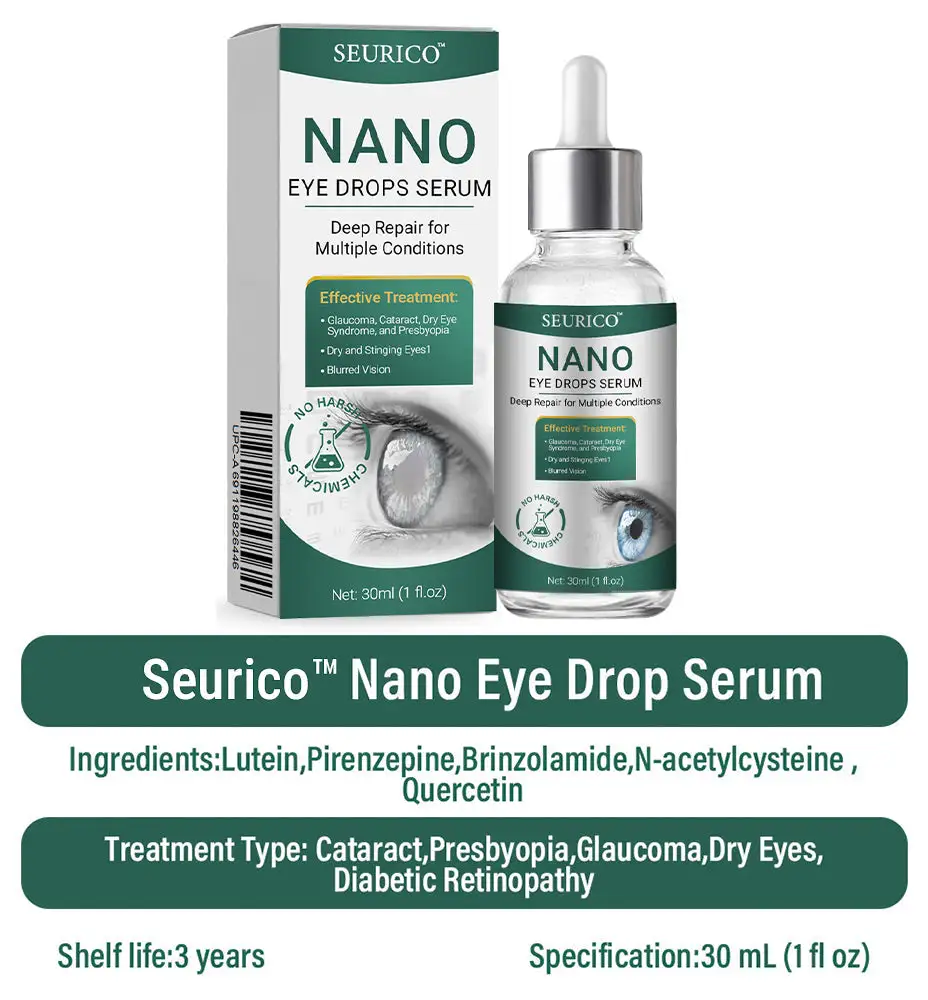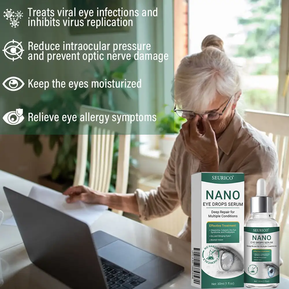 Seurico™ Nano Eye Drops Serum combines 5 essential ingredients to target dryness, fatigue, and blurry vision — right at the source. Each drop restores, protects, and revitalizes your eyes with deep, lasting care.