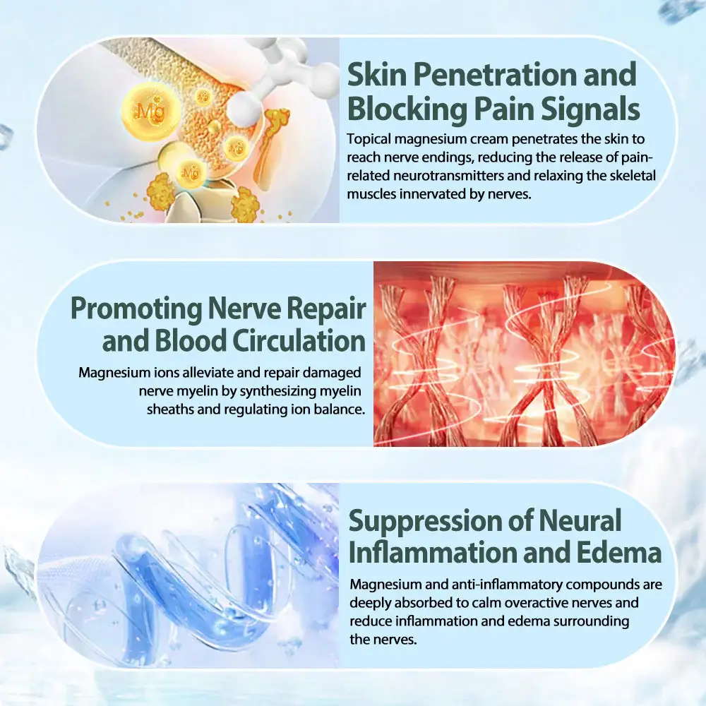 Our topical magnesium cream penetrates the skin to reach nerve endings directly—blocking pain signal transmission, reducing the release of pain-related neurotransmitters, and relaxing the skeletal muscles innervated by nerves. You’ll feel a cooling relief from tingling, burning, or electric shock-like sensations within minutes, and the effect lasts all day. Studies show transdermal absorption delivers magnesium to nerve cells 12 times faster than oral supplements.