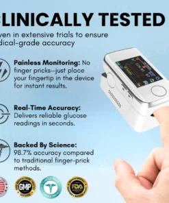 Glycenx™ is a cutting-edge glucose monitoring solution that has been rigorously tested and validated by leading healthcare experts, including endocrinologists and specialists from the American Diabetes Association. These professionals endorse Glycenx™ for its unparalleled accuracy, reliability, and non-invasive technology, ensuring it meets the highest standards in blood sugar care. Extensive clinical trials have proven that Glycenx™ delivers glucose readings comparable to traditional methods, all without the pain or inconvenience of finger pricks. The device’s advanced multi-sensor technology allows for precise, real-time monitoring of blood glucose levels, making it an ideal choice for individuals seeking a comfortable and trustworthy alternative for glucose monitoring & management.