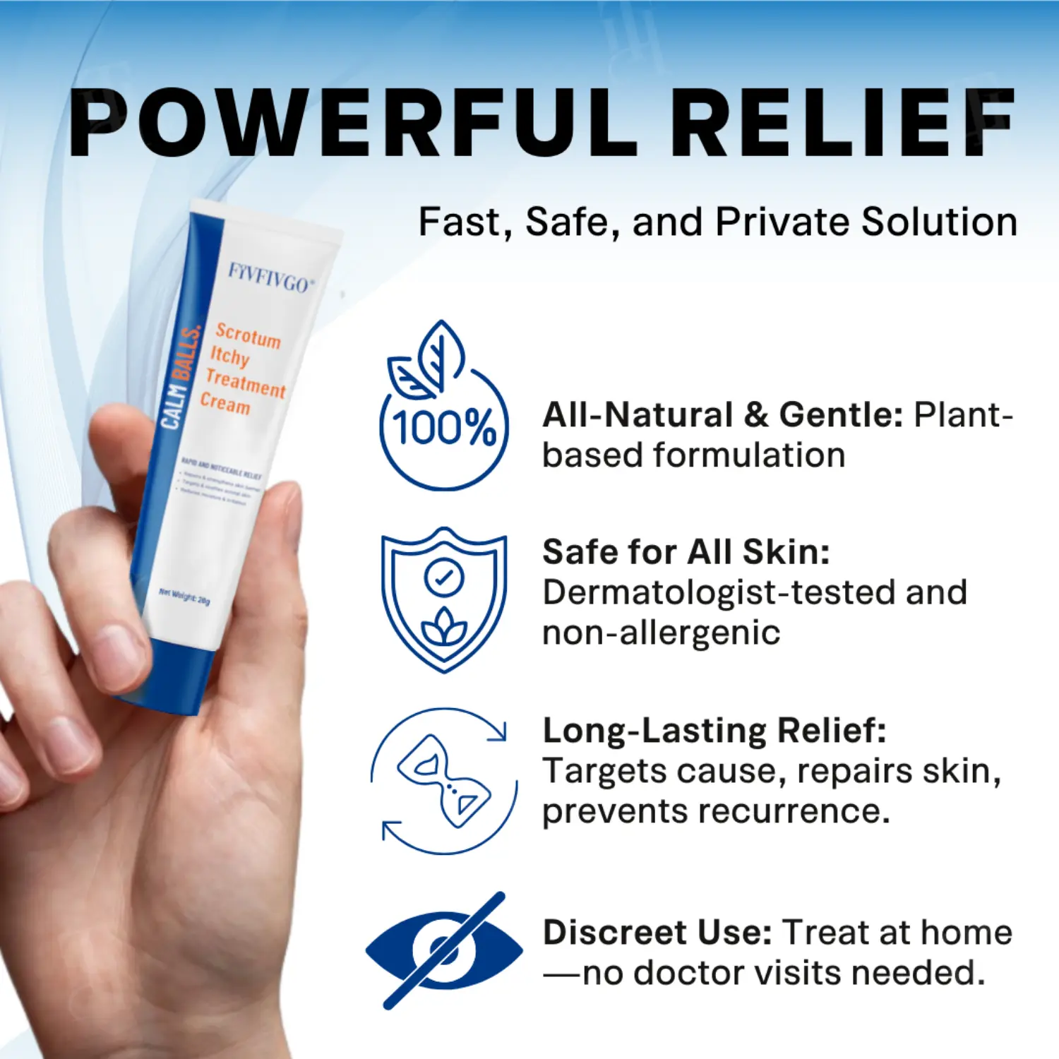 Now, there’s a solution that doesn’t just promise relief—it delivers it. Introducing Fivfivgo® Scrotum Itchy Treatment Cream, the fast-acting, all-natural remedy that’s changing lives across the globe. Designed to treat this deeply personal condition in the privacy of your own home, Fivfivgo® is your chance to finally break free from the itch and reclaim your confidence.