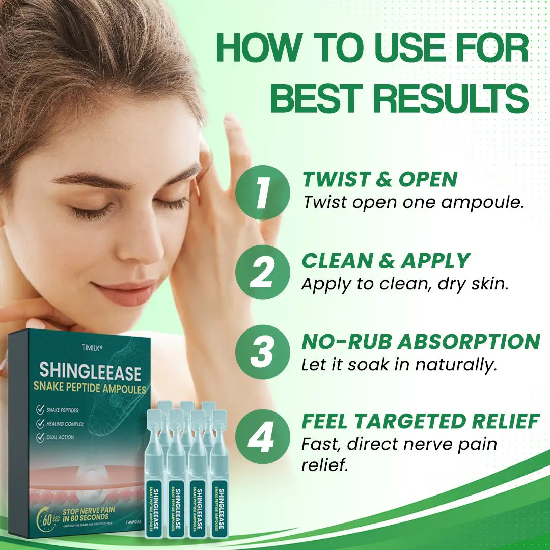 “Shingles pain had me at my limit—constant stinging and nerve discomfort. My wife found Timilk® ShingleEase Snake Peptide Ampoules, and I was skeptical, but after the first application, I felt the burning fade within seconds. Within a few days, my skin wasn’t just less painful, it looked healthier too. I like that it’s topical—no more pills that make me groggy. This really changed my quality of life.” – Michael T., 58, Ohio