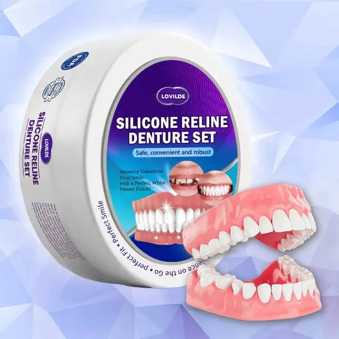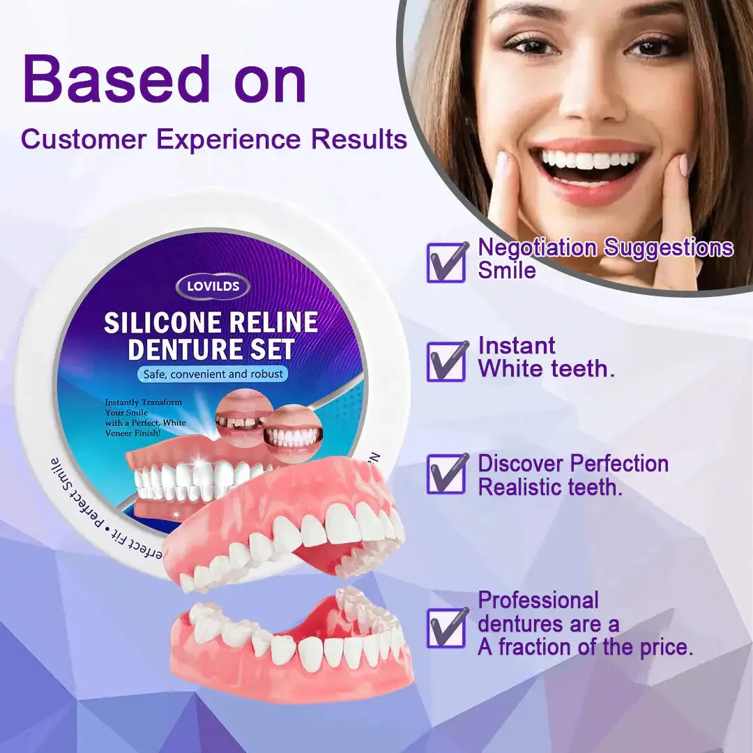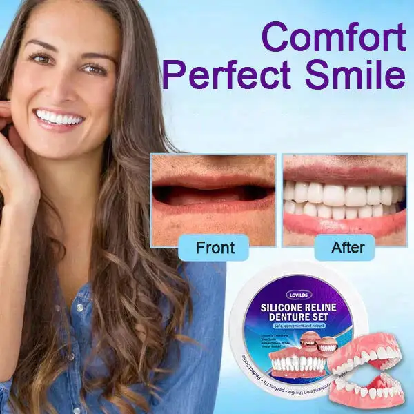 🌟 Instant Perfect Smile: Transform your smile instantly with the LOVILDS™ 𝐒𝐢𝐥𝐢𝐜𝐨𝐧𝐞 𝐑𝐞𝐥𝐢𝐧𝐞 𝐃𝐞𝐧𝐭𝐮𝐫𝐞 𝐒𝐞𝐭. Experience the satisfaction of achieving a flawless, customized fit right away. Our innovative denture set eliminates the discomfort of poorly fitting dentures, offering you a snug and natural feel that makes your dentures feel like a true part of your mouth. Say goodbye to sore spots and irritation as LOVILDS™ Denture Set provides immediate relief, allowing you to enjoy your smile with newfound confidence and comfort. Enjoy a seamless transition to a better-fitting, more comfortable denture experience without delay.