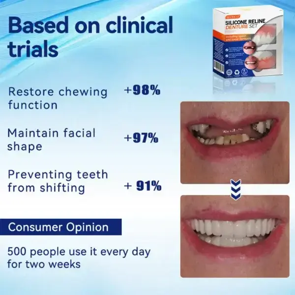 Seurico™ is dedicated to transforming lives through innovative dental solutions that enhance both your physical comfort and emotional well-being. Experience the freedom and confidence that so many others have already embraced with the Seurico™ Silicone Reline Denture Set. Join our growing community and discover how effortless it can be to enjoy a radiant, confident smile every day!