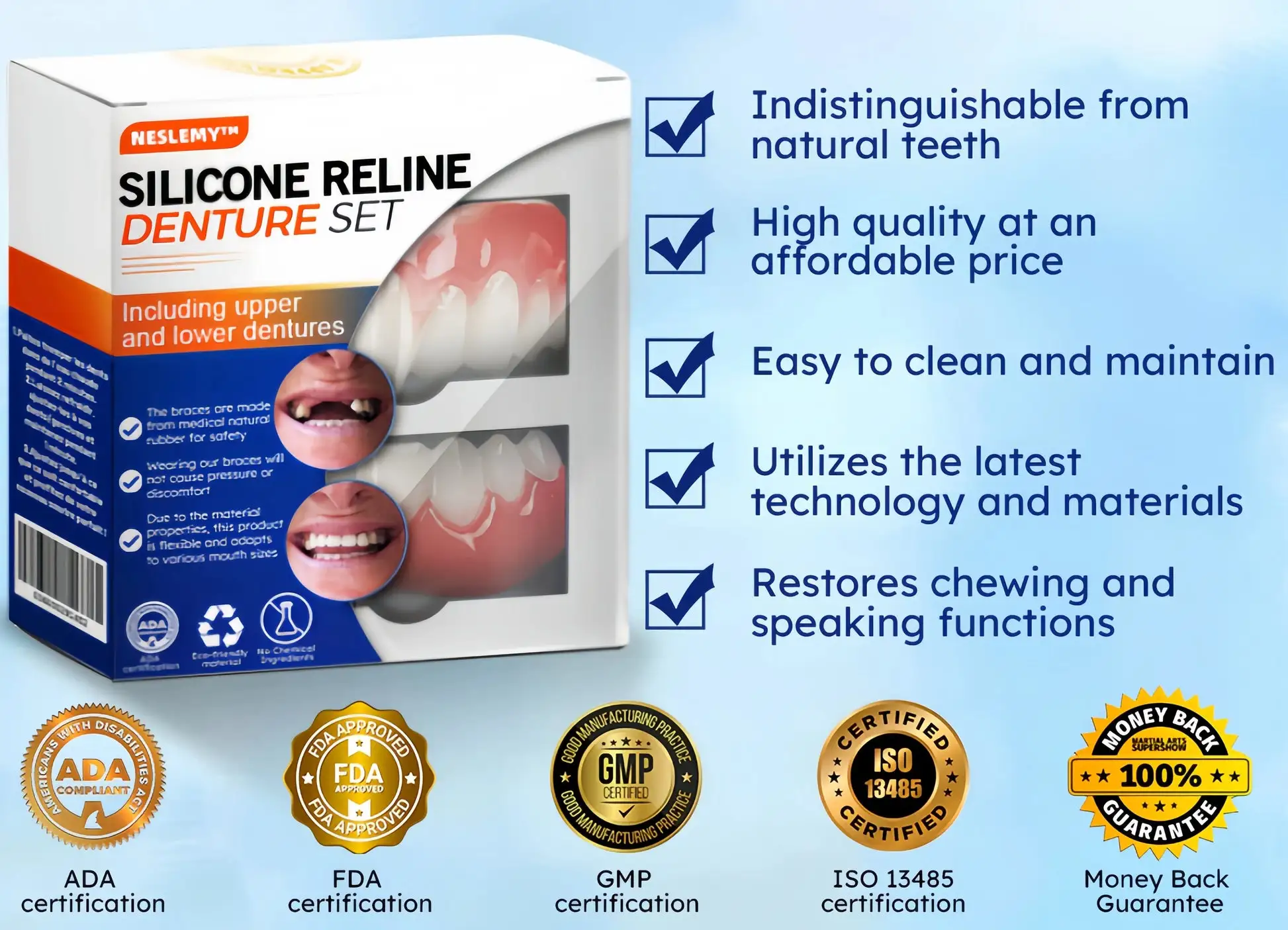 NESLEMY™ is dedicated to transforming lives through innovative dental solutions that enhance both your physical comfort and emotional well-being. Experience the freedom and confidence that so many others have already embraced with the NESLEMY™ Silicone Reline Denture Set. Join our growing community and discover how effortless it can be to enjoy a radiant, confident smile every day!